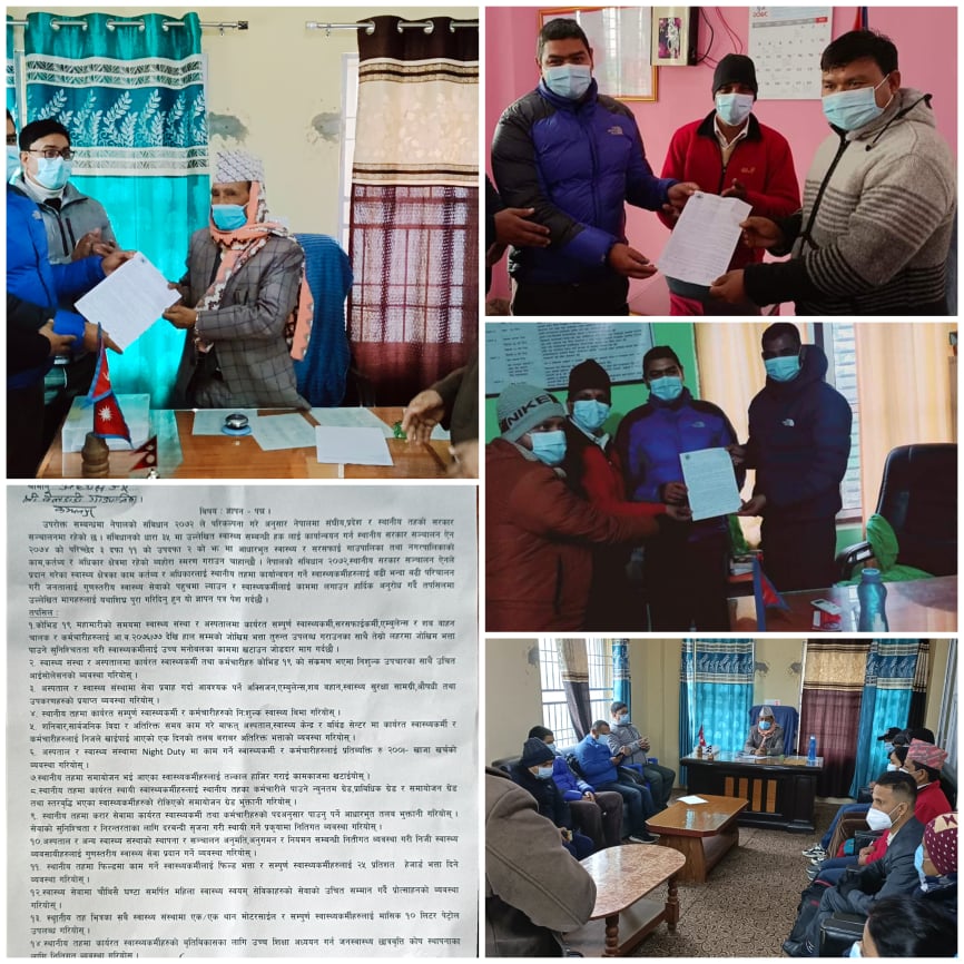हरेक संकटका बेलामा स्वास्थ्य जस्तो सम्बेदनशील विषयमा दिन रात नभनी अग्रपंतीमा खटिएर काम गर्ने स्वास्थ्यकर्मीहरु माथि स्थानिय तहहरुले सेवा सुविधाका सवालमा विभेद गरेको भन्दै आफ्ना पेशागत हकहितका लागि संगठनले राखेका विभिन्न मागहरु पुरा गरीदिन ज्ञापन पत्र बुझाउने कार्यक्रम गरीरहेको नेपाल स्वास्थ्य प्राविधिक संघका जिल्ला अध्यक्ष मान बहादुर चन्दले बताउनु भयो ।