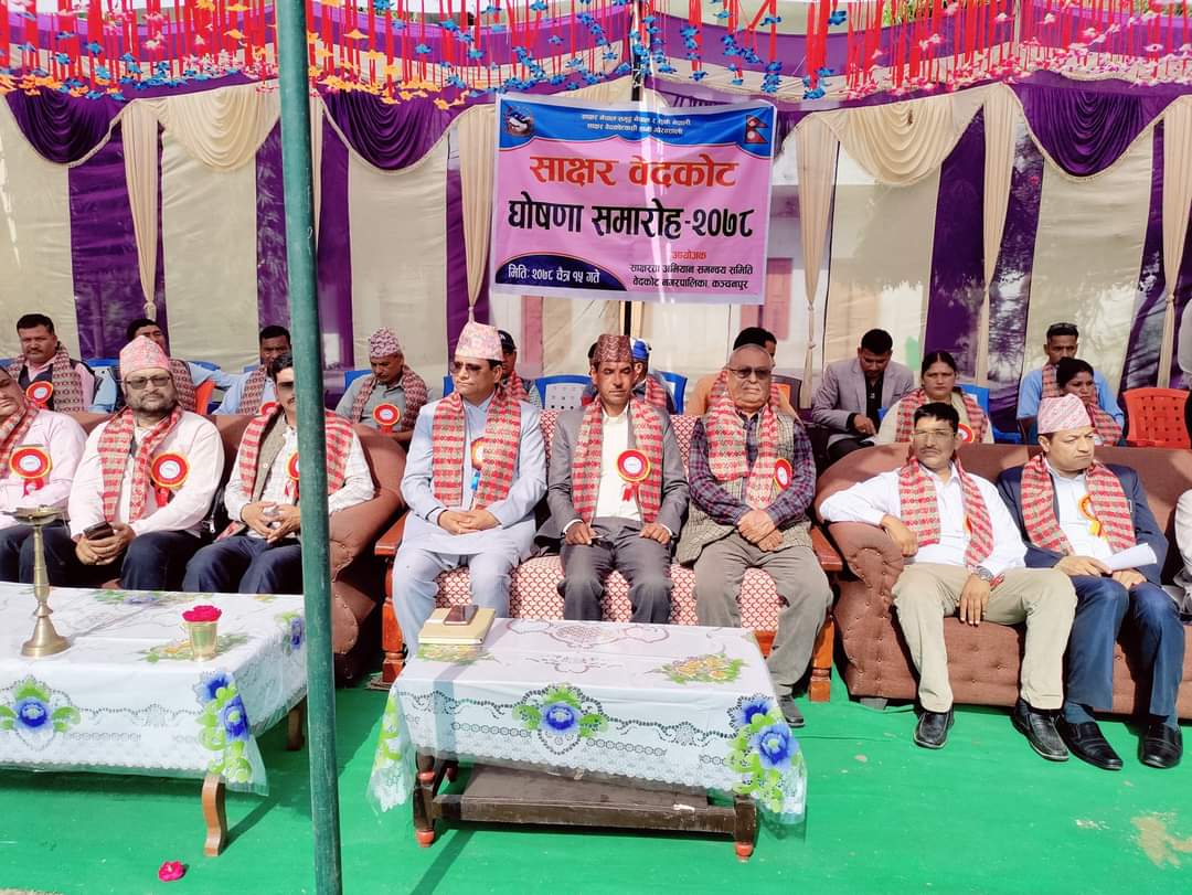 कञ्चनपुर -बेदकोटलाई साक्षर नगरपालिका घोषणा गरिएको छ । मंगलबार भुवनेश्वरी मावि सिशैयाको प्राङ्गणमा एक कार्यक्रम आयोजना गर्दैै बेदकोटलाई साक्षर नगर घोषणा गरिएको हो ।