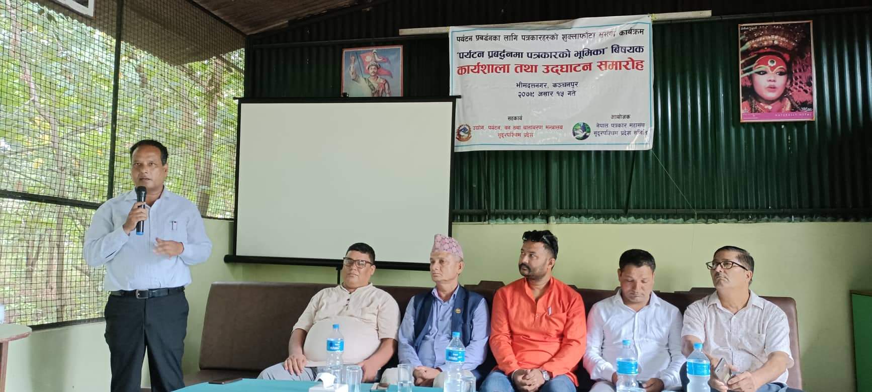बुधबार कञ्चनपुरमा उद्योग, पर्यटन वन तथा वातावरण मन्त्रालयको आर्थिक सहयोग एव नेपाल पत्रकार महासंघ सुदूरपश्चिम प्रदेशको आयोजनामा ‘पर्यटन पर्यटनका लागि पत्रकारको भूमिका विषय कार्यशाला गोष्ठी समारोहमा पर्यटन प्रर्बद्धनका लागि पत्रकारको भूमिका महत्वपूर्ण हुने सरोकारवाला पक्षले बताएका हुन ।