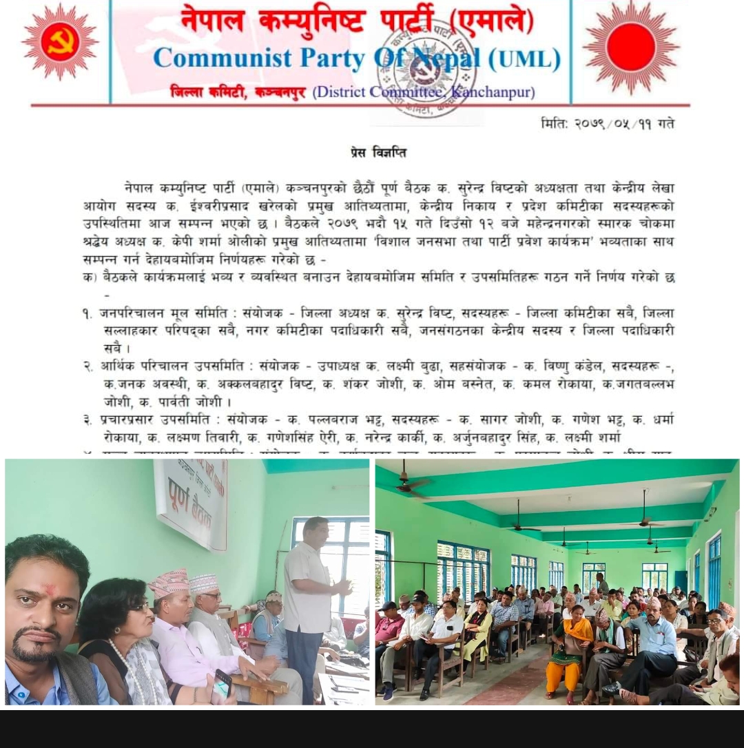 एमाले कञ्चनपुरका अध्यक्ष सुरेन्द्र विष्टको अध्यक्षतामा आज बसेको पुर्ण बैठकले यसै भदाै १५ गते आयोजना गर्ने विशाल आम सभाको कार्यक्रम तय गदै सो कार्यक्रमलाई सम्बोधन गर्न अध्यक्ष ओली कञ्चनपुर आउन लागेका हुन ।
