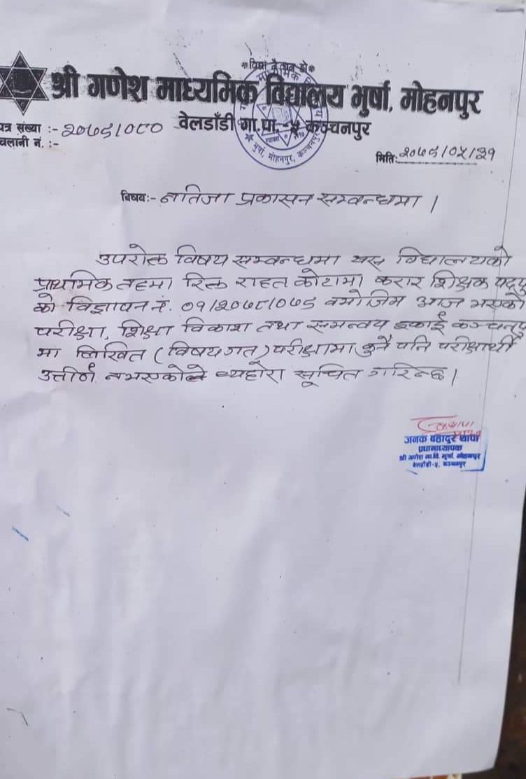 शुक्रबार साझ विद्यालयका प्रअ जनक बहादुर थापाद्वारा हस्ताक्षरित एक सुचना जारी गर्दै विषयगत परिक्षामा काेहि पनि सफल हुन नसकेकाे जनाएकाे छ ।