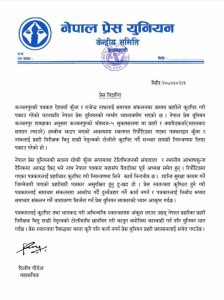 प्रेस युनियनका महासचिव दिलीप पौडेलले आज एक विज्ञप्ति प्रकाशित गरी पत्रकारलाई कुटपिट, सञ्चार सामग्री नियन्त्रण्मा लिने, धरपकड गरी अभिव्यक्ति स्वतन्त्रतामा अंकुश लाउन उद्यत् नेपाल प्रहरीका प्रहरी निरीक्षक बिनु शाही नेतृत्वको टोलीमाथि छानविन गरी कानुन बमोजिम कारबाही गर्न माग गरेका हुन् ।