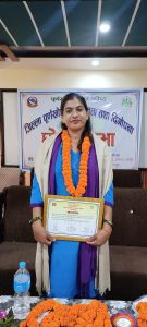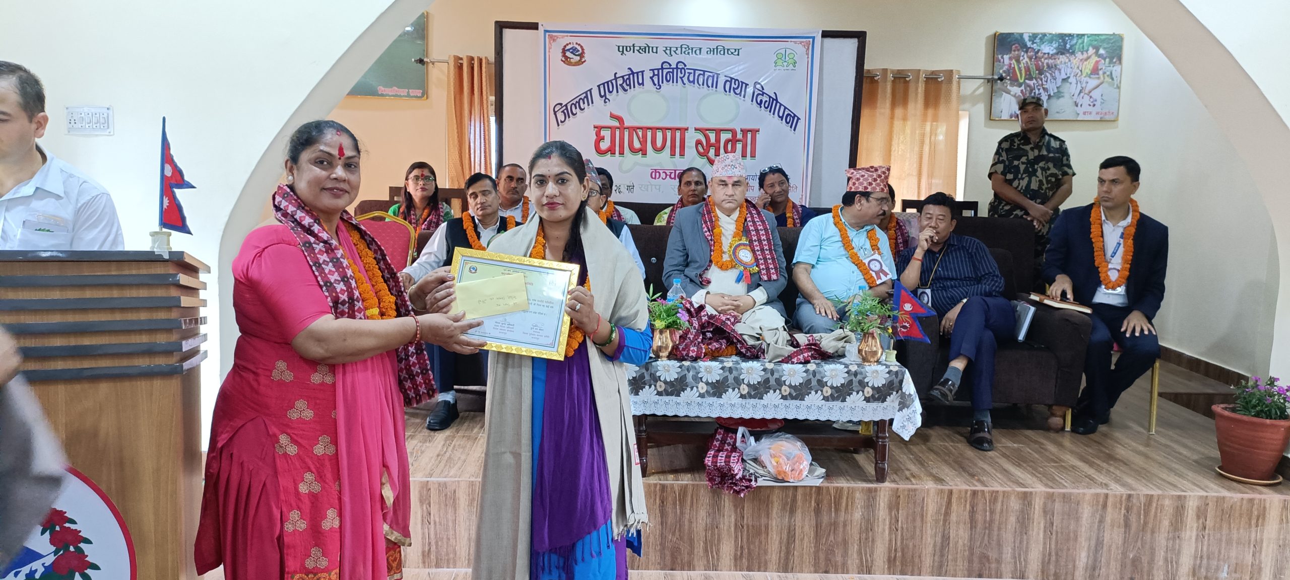 सुदूरपश्चिमका मुख्य मन्त्री कमल बहादुर शाहकाे प्रमुख आतिथ्यततामा सम्पन्न पुर्ण खाेप जिल्ला घाेषणा कार्यक्रममा जिल्लाका सबै पालिकामा उकृष्ट कार्य गर्ने स्वास्थ्यकर्मी तथा महिला स्वास्थ्य स्वयम् सेविकालाई सम्मानित कार्य याेजना अनुसार बेलडाँडी गाउँपालिकामा उकृष्ट कार्य गरेबाफत अनमि भट्ट सम्मानित हुनु भएकाे हुन ।