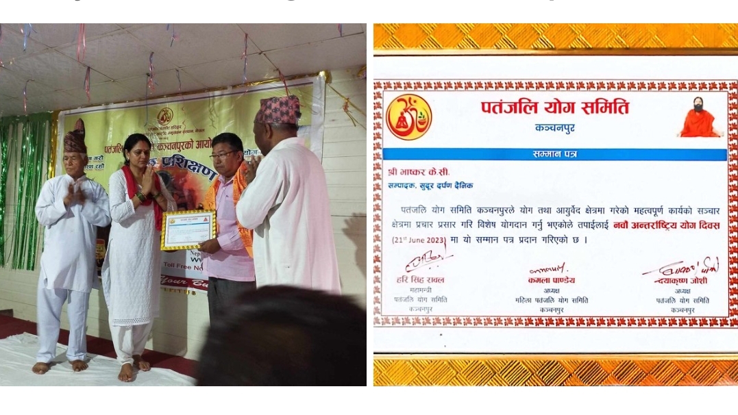 कञ्चनपुर-पतंजली योग समिति कञ्चनपुरले पत्रकार भाष्कर केसीलाई सम्मान गरेको छ । पतंजली योग समिति कञ्चनपुरले पत्रकार केसीलाई नवौँ अन्र्तराष्ट्रिय योग दिवसको अवसरमा सम्मान गरेको हो ।