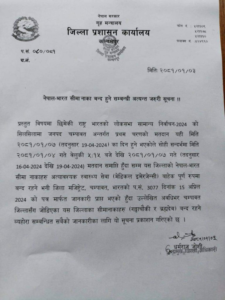 भारतकाे जनपद चम्पावतमा यहि बैशाख ७ गतेका दिन प्रथम चरणकाे मतदान सम्पन्न हुने भएकाले बैशाख ४ साँझ ५ बजेबाट ७ गते सम्म साे क्षेत्रसंग सिमा जाेडिएका गड्डाचाैकि र ब्रह्मदेव सिमा नाका ४ दिनका लागि बन्द गरिने जिल्ला प्रशासन कार्यालय कञ्चनपुरले जनाएकाे छ ।