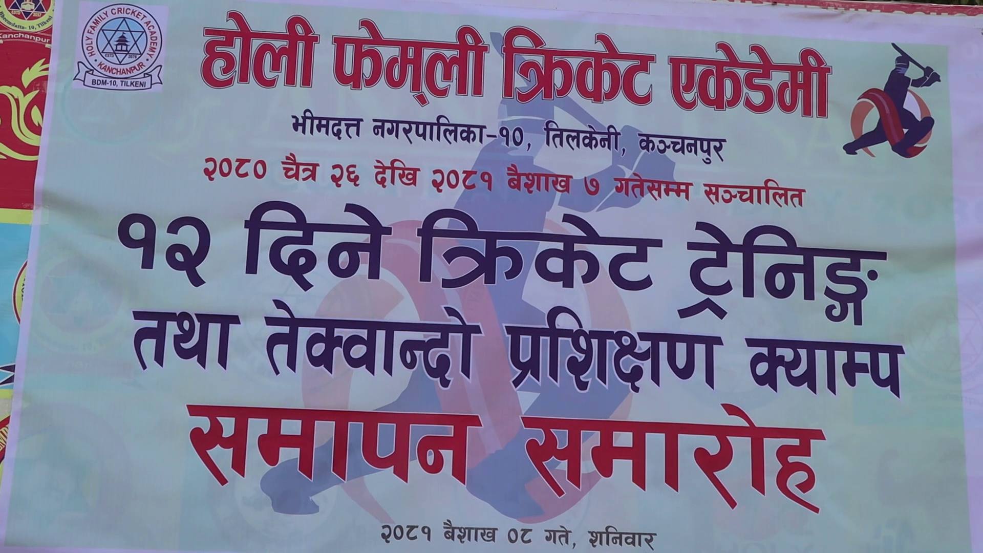 डिल्लीराज पन्त /कञ्चनपुर– भीमदत्त नगरपालिका १० तिल्केनीस्थित होली फेमली इङ्गलिश मिडियम स्कुलको खेल मैदानमा सञ्चालित १२ दिने क्रिकेट ट्रेनिङ्ग तथा तेक्वान्दो प्रशिक्षण क्याम्प समापन भएको छ ।