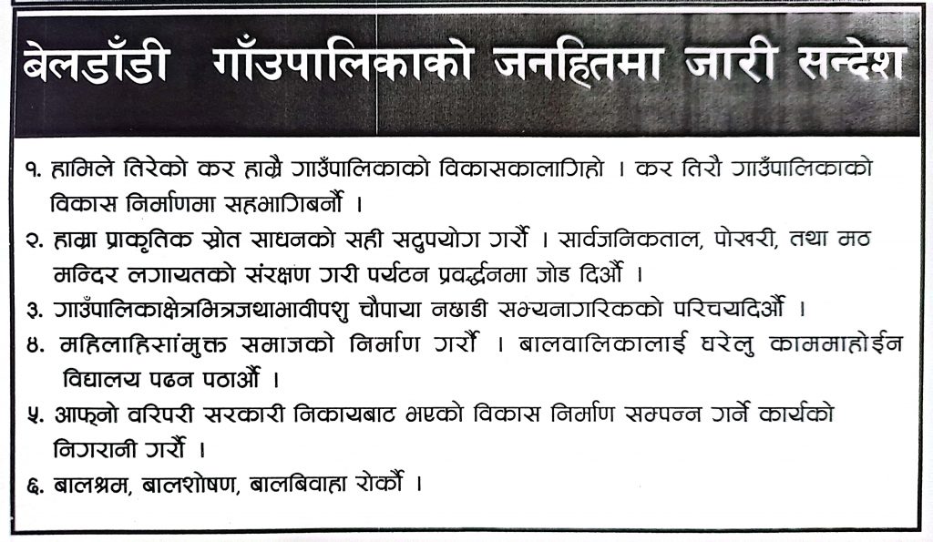 रमेश प्रसाद भट्ट/कञ्चनपुर– जिल्लाकाे बेलडाँडी  गाउँपालिकाले आगामी आवका लागि कूल ५३ करोड १६ लाख ७२ हजार बराबरको बजेट प्रस्तुत गरेकाे छ ।