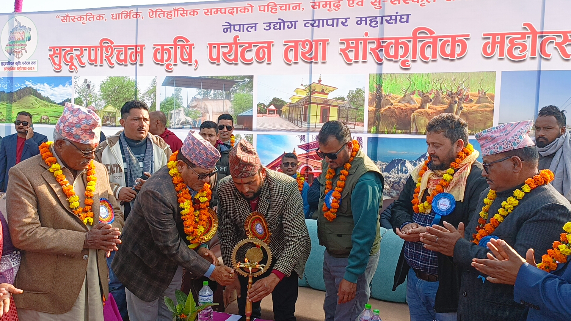 रमेश प्रसाद भट्ट/कञ्चनपुर- कञ्चनपुरको महेन्द्रनगर खुला मञ्चमा सुदूरपश्चिम कृषि, पर्यटन तथा साँस्कृतिक महोत्सव शुरु भएको छ । ‘साँस्कृतिक धार्मिक ऐतिहासिक पर्यटकिय सम्पदाको पहिचान सम्बृद्ध एव सुसंस्कृत समाज निर्माणमा हाम्रो अभियान’ भन्ने मुल नारा अघि सारेर सुदूरपश्चिम कृषि, पर्यटन तथा साँस्कृतिक कञ्चनपुर पर्यटन महोत्सव संचालन भएको हो ।