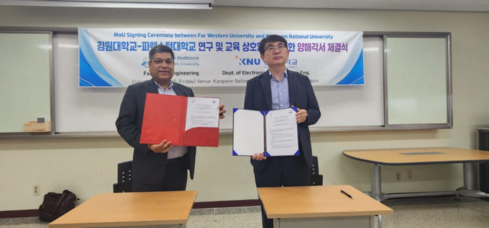 महेन्द्रनगर -सुदूरपश्चिम विश्वविद्यालयको इन्जिनियरिङ संकाय र दक्षिण कोरियाको काङ्वोन नेशनल युनिभर्सिटी अन्तर्गतको इलेक्ट्रोनिक तथा एआई प्रणाली इन्जिनियरिङ विभागबीच आपसी शैक्षिक तथा अनुसन्धान सहकार्यका लागि समझदारीपत्र (MoU) आदान–प्रदान गरिएको छ।