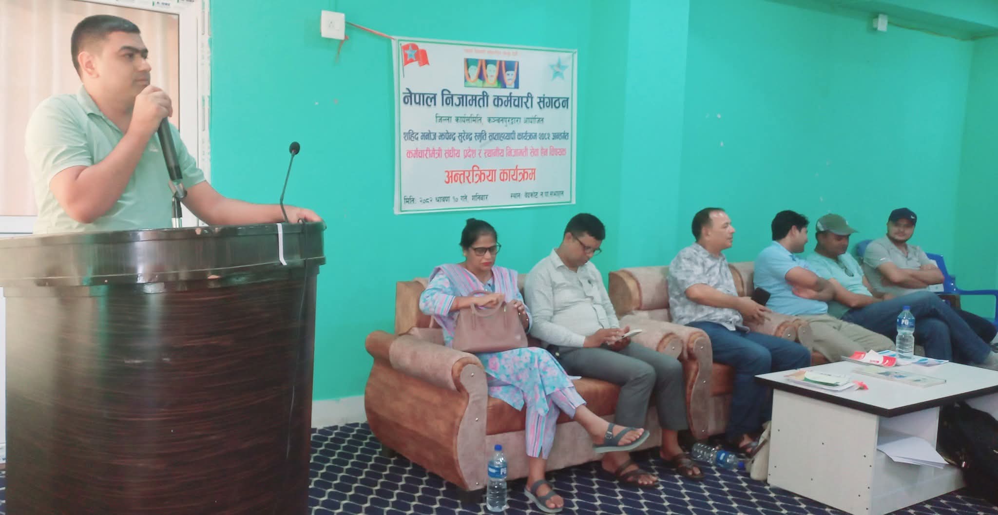 नेपाल निजामती कर्मचारी संगठन जिल्ला अध्यक्ष मान बहादुर चन्दले शहिद मनोज झपेन्द्र सुरेन्द्र स्मृति सप्ताहव्यापी कार्यक्रमलाई लक्षित गरेर कर्मचारीमैत्री निजामती सेवा ऐन विषयक अन्तरकृया गरेको बताए ।