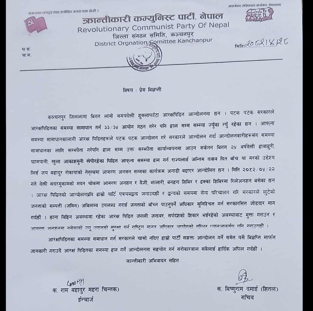क्रान्तिकारी कम्युनिष्ट पाटी कञ्चनपुरका इन्चार्ज राम बहादुर महरा(चिन्तक) र सचिव विष्णूराम दमाई(शित्तल)द्वारा संयुक्त रुपमा हस्ताक्षरित गरिएको विज्ञप्तीमा आरक्षपीडितको समस्या समाधान गर्न सरकार जिम्मेबार नदेखिए पाटीले पीडितकोे हक अधिकारका लागि संघर्षको चेतावनी दिएको छ ।