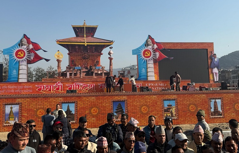 लिच्छविकालमा राजा हरिदत्तले स्थापना गरेको चाँगुनारायणको ऐतिहासिक मन्दिरलाई एमालेले मुख्य स्वरुपमा राखेर उपत्यकाका महत्त्वपूर्ण विभिन्न मन्दिर एकै ठाउँ देखाउने गरी ठूलो र कलात्मक मञ्च निर्माण गरेको जनाएको छ । टाढासम्म रहेका सहभागीले वक्ताले बोलेको प्रस्ट देखिने गरी मञ्चको दायाँबायाँ ३० फिट अग्ला दुईवटा ‘एलइडी स्क्रिन’ राखिएका छन् । तीन किलोमिटर परसम्म सुन्न सकिने एक सय १५ वटा उच्च गुणस्तरका ‘साउन्ड सिस्टम’ जडान गरिएको र मञ्च अगाडि देशभरबाट आएका नेता, मन्त्री, सांसद एवम् विभिन्न कुटनीतिक नियोगका प्रतिनिधिका लागि २५ हजार कुर्सी राखिएको एमालेले जनाएको छ ।