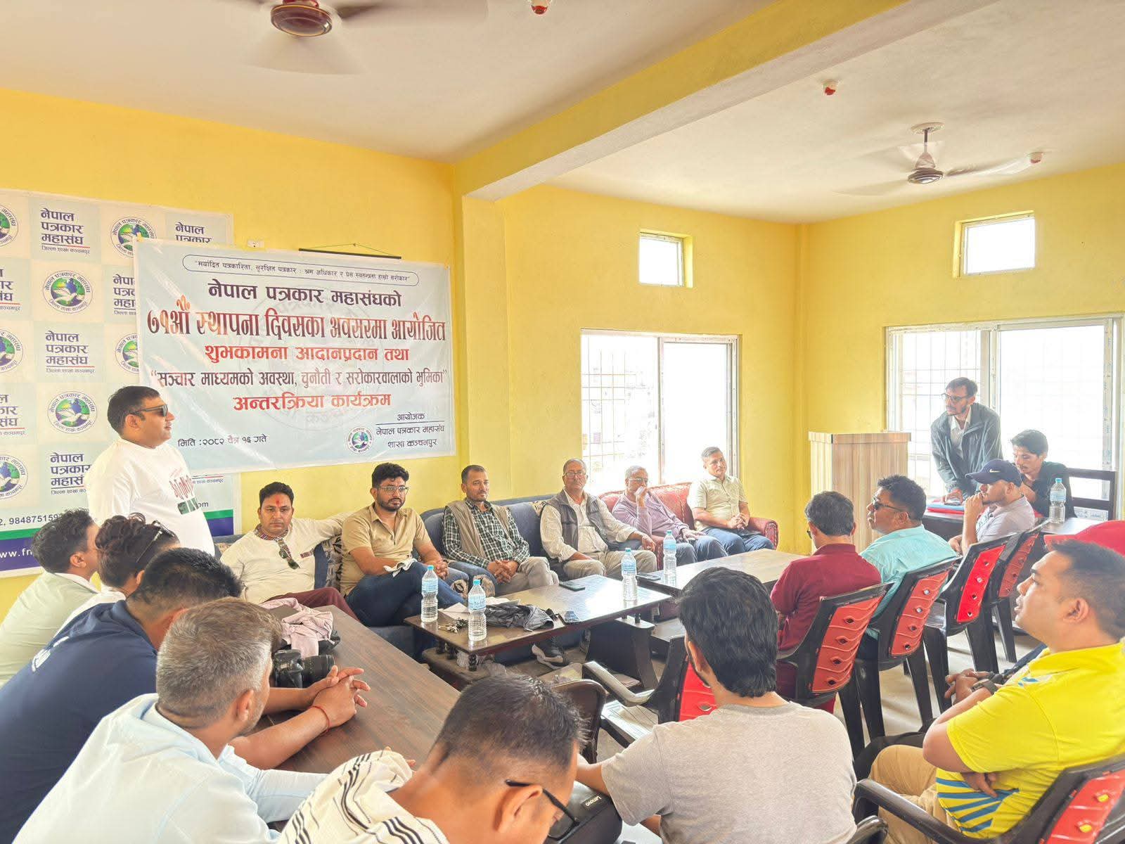 साेमबार महेन्द्रनगर स्थित महासंघकाे कार्यालयमा “मर्यादित पत्रकारिता, सुरक्षित पत्रकार : श्रम अधिकार र प्रेस स्वतन्त्रता हाम्रो सरोकार” भन्ने मूल नाराका साथ महासंघको ७१औँ स्थापना दिवसको अवसरमा शुभकामना आदान–प्रदान तथा “सञ्चार माध्यमको अवस्था, चुनौती र सरोकारवालाको भूमिका” विषयक अन्तरक्रिया कार्यक्रम सम्पन्न भएको हाे ।